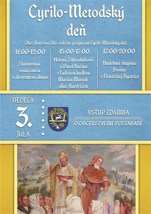 Obec Kotešová s podporou Krajského kultúrneho strediska v Žiline Vás srdečne pozýva na podujatie: "Cyrilo-Metodský deň v Kotešovej", ktoré sa uskutoční v nedeľu 03. júla 2016 v drevenom altáne za kultúrnym domom s nasledovným programom: